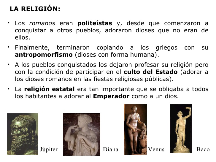 La religión de los romanos era politeísta (adoraban un gran número de dioses). Los más venerados eran Júpiter, Minerva y Juno.